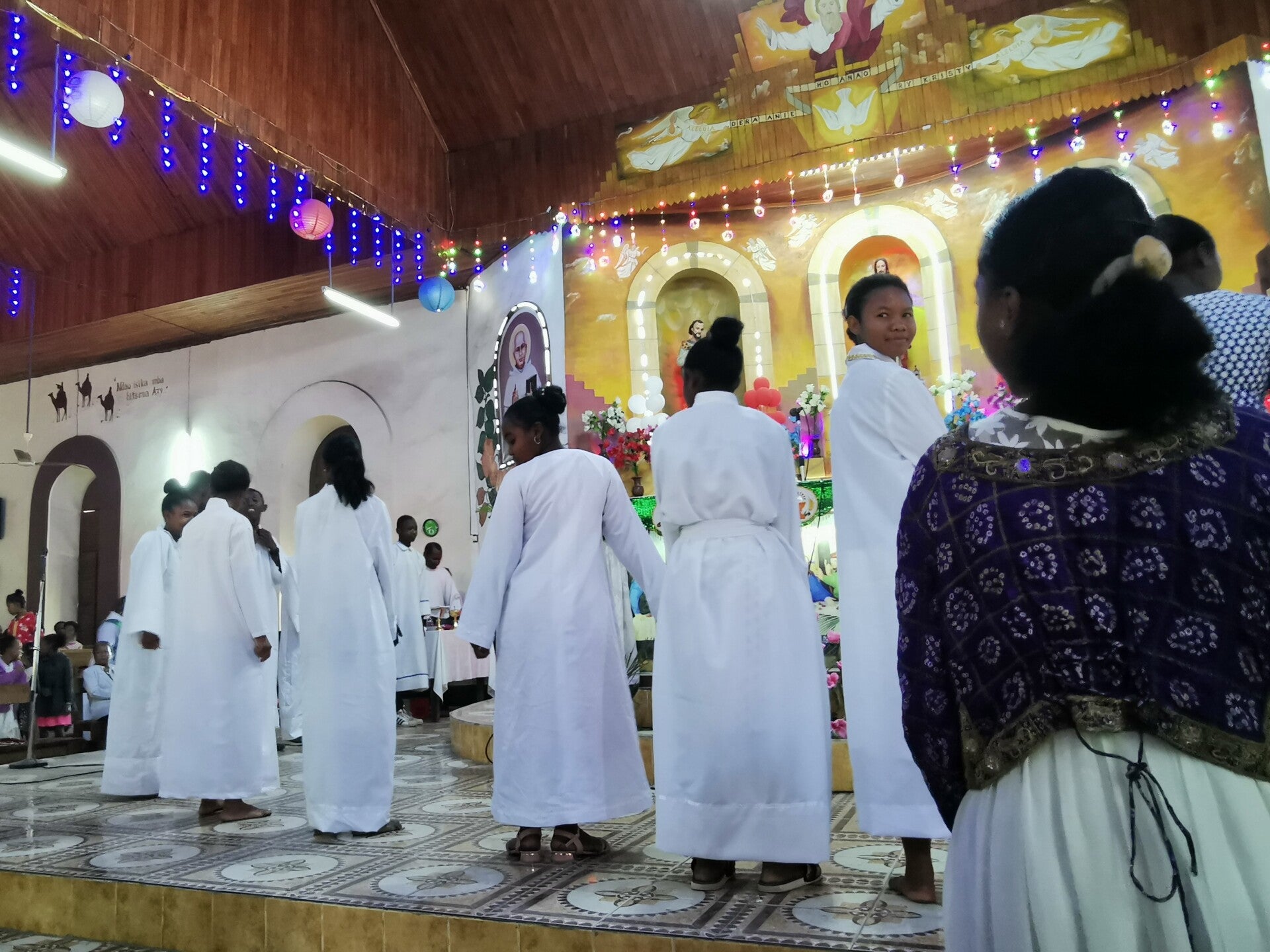 Dreistimmig und mit der schönen Sprache hier schafften sie es mehrmals, mir Gänsehaut zu bescheren. Es gab zwei verschiedene Chöre, die den Gesang anleiteten, ganz viele Ministranten, die eifrig am Altar halfen und zwei Keyboardspieler, die sich abwechselten, um die Sänger musikalisch zu begleiten. Alle paar Minuten erklang ein neues Lied. Mir war es erlaubt zu filmen und als ich gerade den Chor am Altar filmte, stupste mich die Schwester an und zeigte nach hinten - aaah, da hatten sich gerade mehrere Leute versammelt, um zu tanzen! Schritt für Schritt bewegten sie sich zur Musik nach vorne Richtung Altar. Bei einem weiteren Tanz tanzten dann nochmehr Leute aus allen Reihen mit- inklusive mir für den Schlussteil, da die Schwester meinte, ich solle mich am Gang dazustellen. Den Kindern hinter mir hat das richtig gefallen, die haben gelacht und gestrahlt 😄.