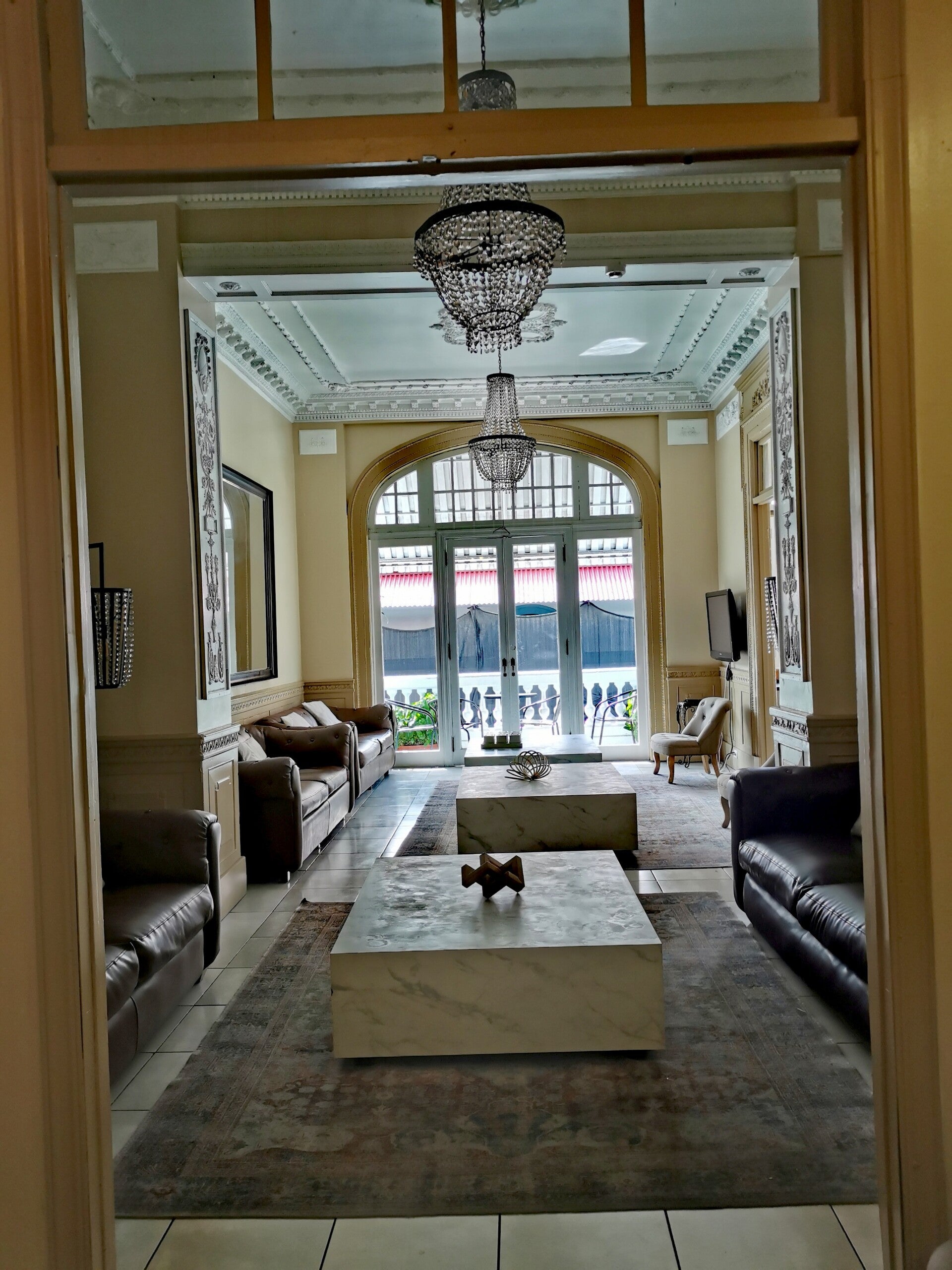Erst diese Morgen machte ich mir ein Bild vom Rest des Hostels. Ich denke auf so fein und dicke Hose hat bisher noch keines gemacht - schaut euch mal die Fotos dazu an. 😅 Mir waren ein sauberes Zimmer und eine saubere Dusche wichtig und beides wurde erfüllt. Noch dazu gab es im "Magnolia Inn" gratis Trinkwasser aus einem Wassertank und einen überaus freundlichen Rezeptionisten. Letzterer erklärte mir den Weg zum nächsten Minimarkt, welcher mir eine Simkarte verkaufen würde. Bargeld hatte ich noch keins, konnte aber mit Karte bezahlen. Generell bezahlt man hier in US-Dollar. Nur Kleingeld gibt es in der Landeswährung Balboa. Die Simcard kostete mich 17 Dollar für zwei Wochen (also ca. halb soviel wie am Flughafen) Internet. Ich bekam auch einen kleinen Einblick in die Altstadt und spazierte an einem Hauptplatz mit lauter Musik, einem kleinen Markt und einer schönen Kirche vorbei.