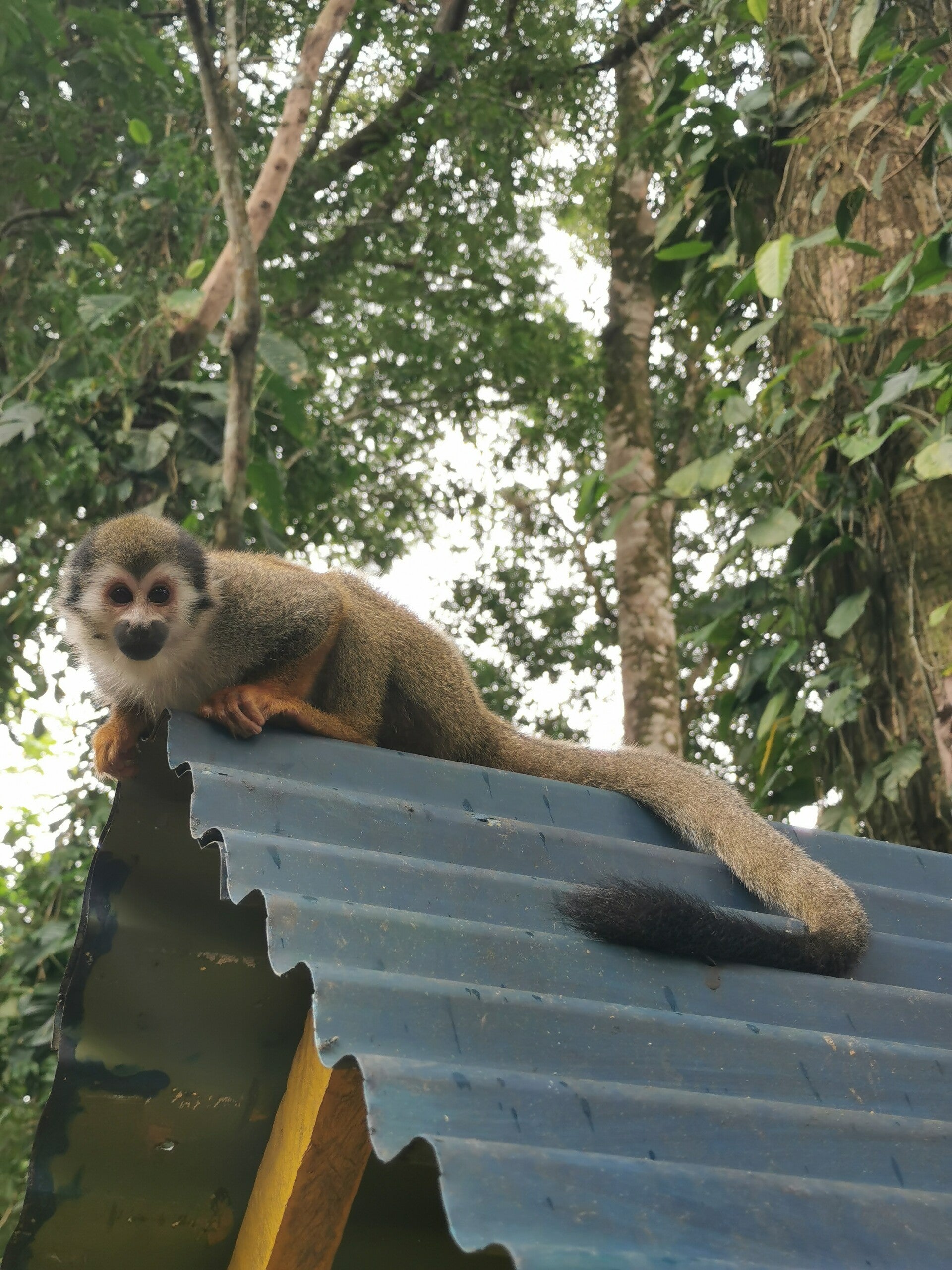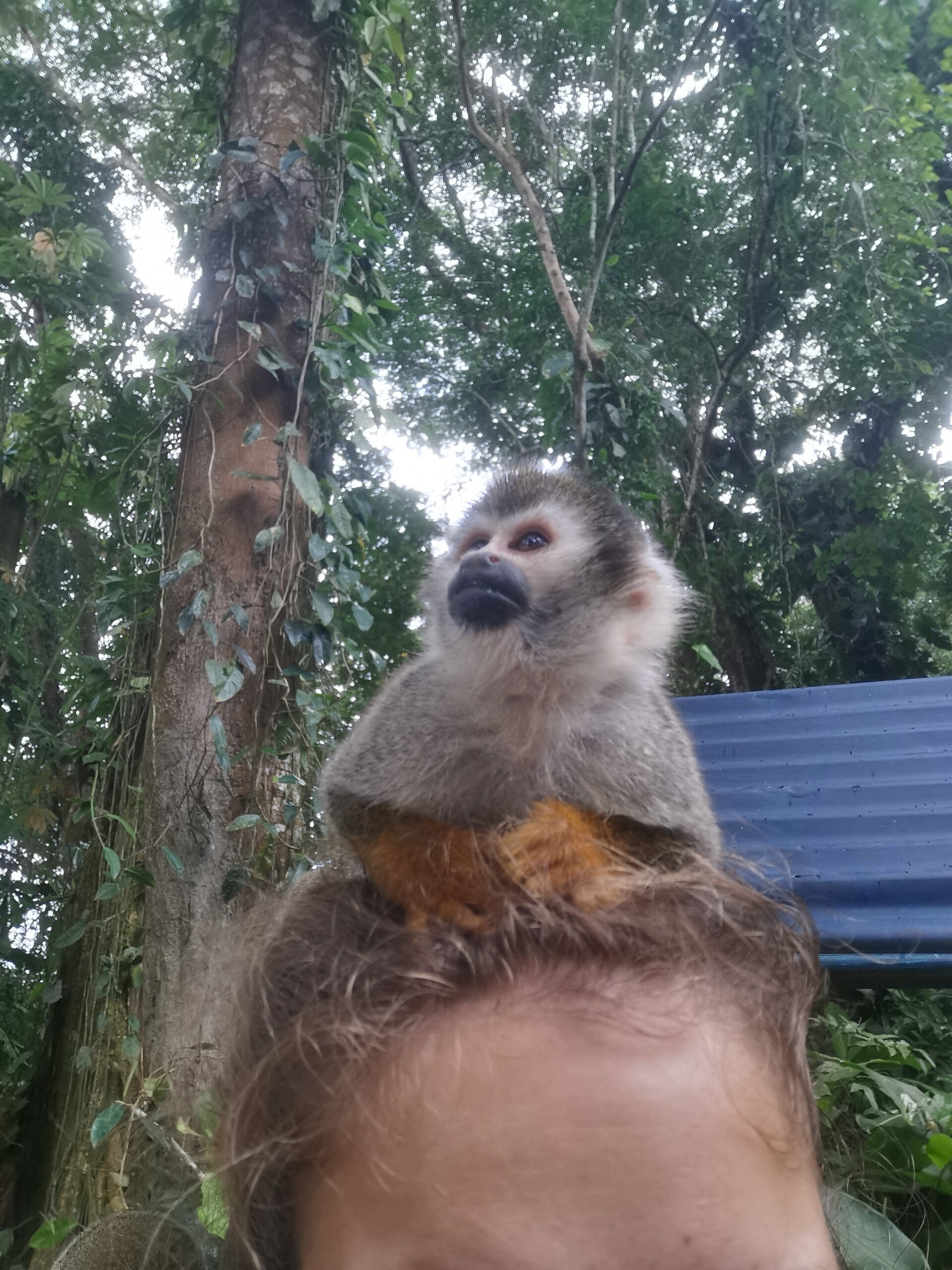 Wir mussten etwas auf unser Boot warten und starteten dann endlich flussaufwärts los. Der Regen hörte währenddessen auch schon wieder auf. Auf zur Affeninsel "Isla de los Micos"! Hier leben mehrere tausend Totenkopfaffen, die sich frei bewegen können und gegen ein Stück Banane gerne auf den Touristen rumturnen. Wie sanft die waren! Keinen einzigen Kratzer trug ich davon. Einer hatte es sich auf meinem Kopf gemütlich gemacht und beschloss dort für gut 10 Minuten zu bleiben. Ganz relaxt kraulte er mich mit seinen Vorderpfoten im Haar ober der Stirn. Nicht zum klassischen "entlausen", sondern eher so nebenbei, ganz gleich wie Katzen mit ihren Pfoten eine Jeans bearbeiten, wenn sie am Schoß sitzen. Leider durfte ich ihn nicht mitnehmen. (;