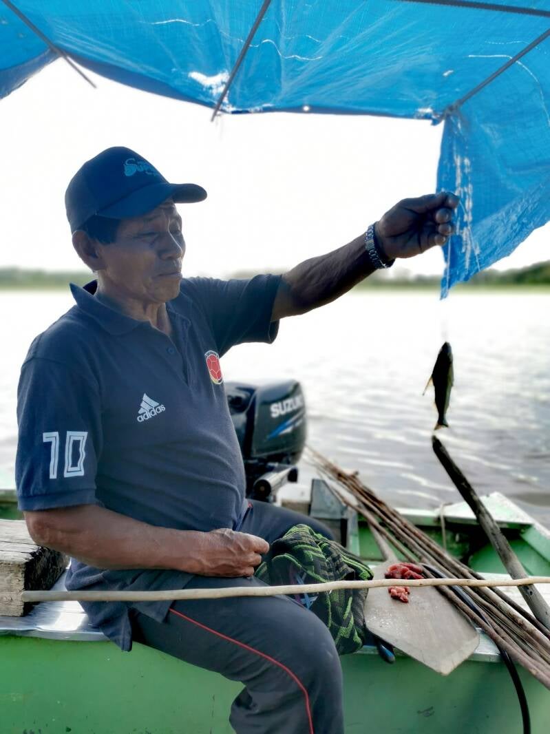 Zurück im Dorf erklimmten wir noch den Aussichtsturm, die Männer kauften sich eine ganze Palette Bier zum Mitnehmen und wir fuhren am Boot weiter zu einem See, der direkt an den Amazonas anschloss. Hier würden wir nun unser Glück beim Fischeangeln ausprobieren! Ich hatte noch nie zuvor geangelt und blieb mit meiner Angel (ein Ast mit Schnur und Hacken dran) dementsprechend auch erfolglos. "Willst du die Fische fangen, oder nur füttern?", wurde ich lachend gefragt. Hahaha, was san ma heute witzig. Wir nutzten übrigens Anakondafleisch als Köder, kein Witz, und anscheinend kam das vor allem bei den Piranhas großartig an. Während wir einen Köder nach dem anderen verschleuderten, fing unser Guide mit jedem einzelnen Versuch einen Fisch raus. Wie zur Hölle...? Nur einer von uns zog einen kleinen Fisch an Board, das war's. Aber Spaß hat es trotzdem ganz viel gemacht! 😇